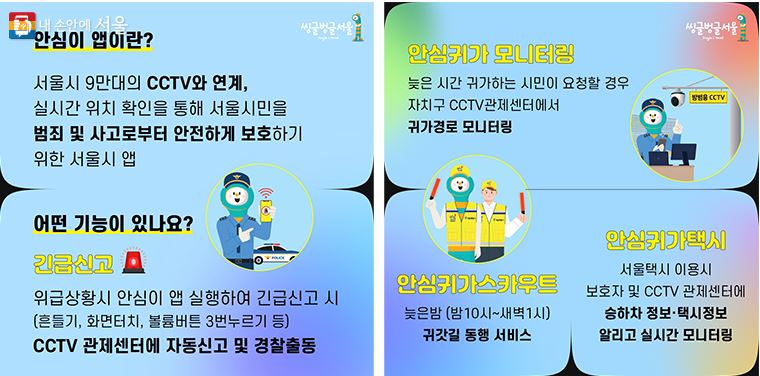 혼자 걸어도 안심하고 귀가할 수 있도록 자치구 CCTV관제센터에서 CCTV로 보고 경찰 출동까지 하는 “서울 안심이”
