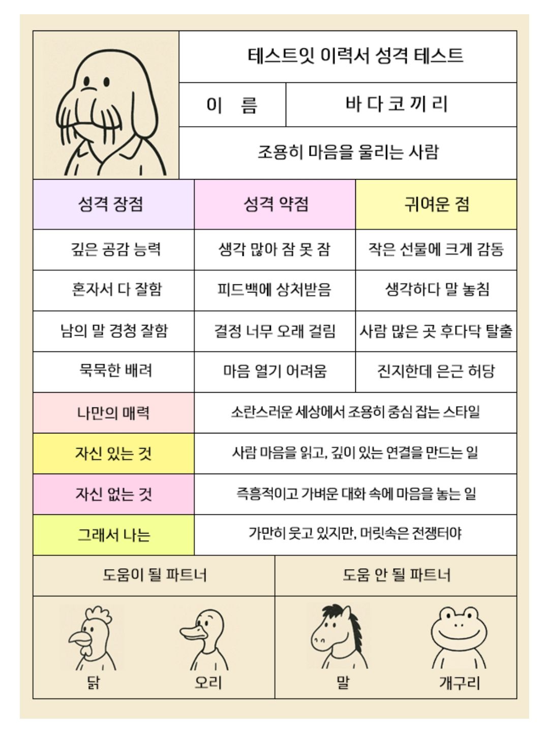 저는 바다코끼리가 나왔네요. 또 한 번 더 해봐도 똑같이 바다코끼리가 나와요. 조용히 마음을 울리는 사람이래요. 사람 많은 곳 후다닥 탈출은 진짜 맞아요.