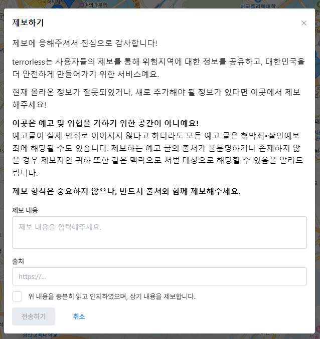 수도권 뿐만 아니라 전국적으로 확인할 수 있게끔 지도에 핀 표시가 되어있는데요. 지금 내가 사는 곳이나 약속장소에 테러 예고가 있는지 확인하기 편하게 시각적으로 잘 나타내주고 있어요.