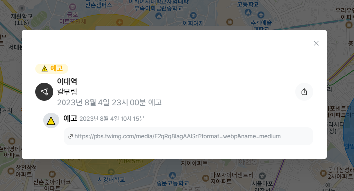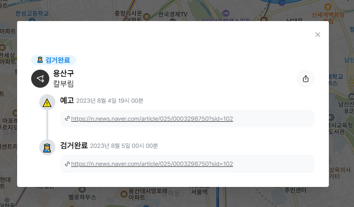 해당 지역 핀을 눌러보면 작성자가 남긴 예고글과 함께 날짜, 시간, 언론기사도 함께 볼 수 있고, 제보도 할 수 있어요.