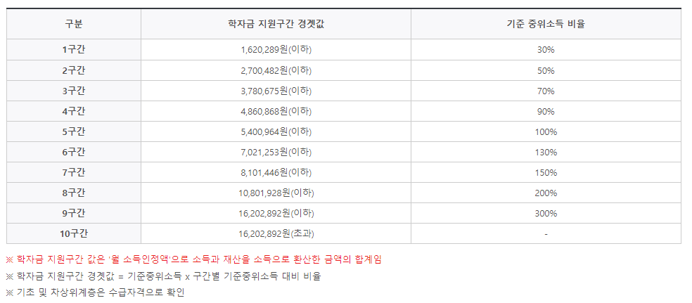 매년 보건복지부에서 발표하는 기준중위소득과 연계하여 학기 단위로 조정되며, 학자금 지원 전 공표됩니다.